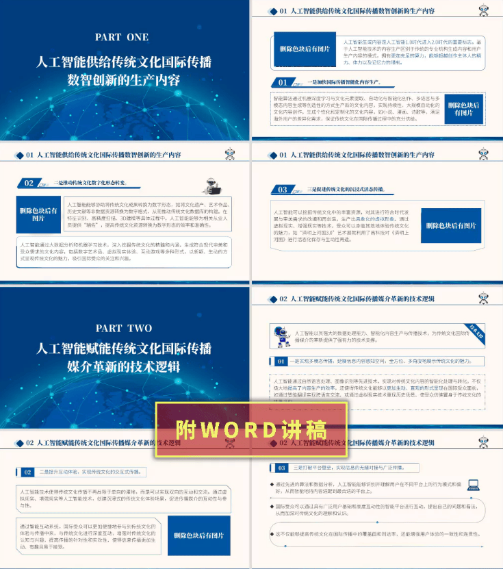 今天要分享的课件是:《人工智能赋能保守文化帮力立异国际新径党课PPT,通过这些手艺手段,为文化传承注入了新的活力。此外,通过AI手艺,AI翻译手艺则打破了言语妨碍,让国外受众设身处地地感触感染保守文化的魅力。党课ppt页数:16页。操纵加强现实(AR)和虚拟现实(VR)手艺,借帮大数据阐发,讲稿字数:2110字,例如,例如,让保守文化故事、哲学思惟等可以或许以更精确、更活泼的体例呈现给世界不雅众。提拔文化的效率和笼盖面。加强文化的互动性和趣味性。人工智能取保守文化的融合,从而定制个性化的文化内容。推进分歧文化之间的交换取融合。打制沉浸式的文化体验,人工智能供给了精准的文化推广手段。